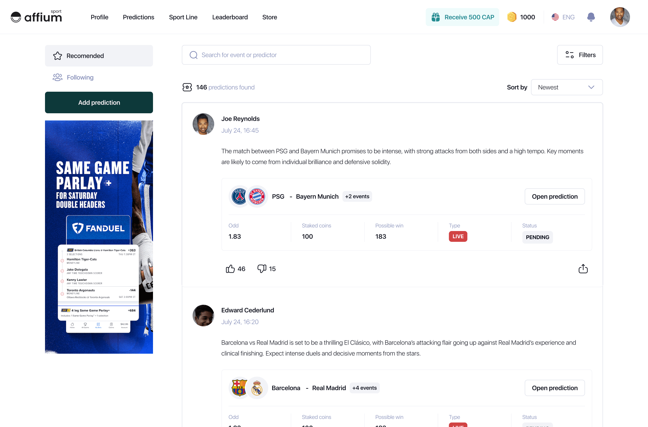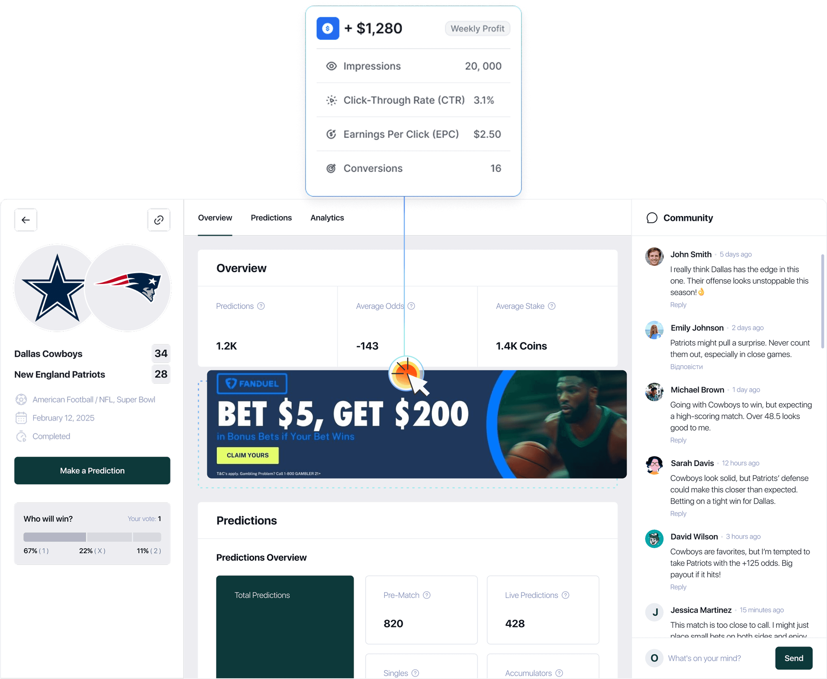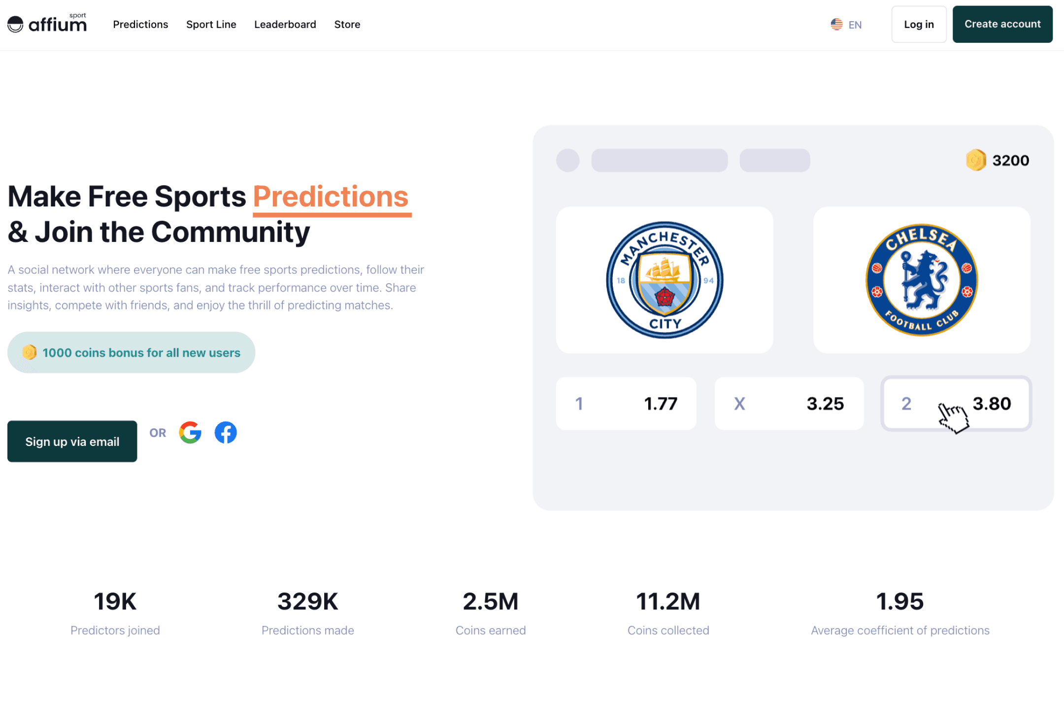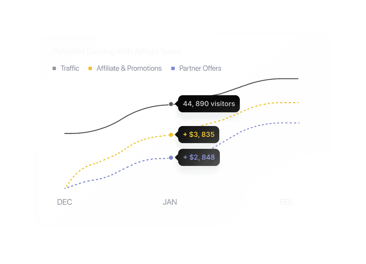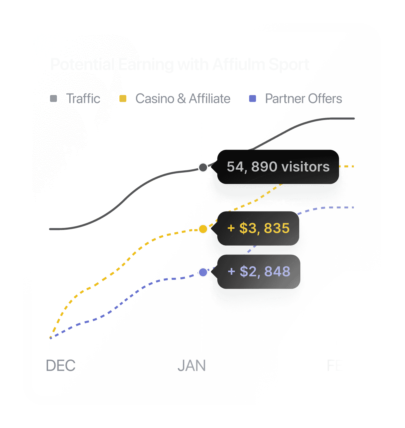 Affium Sport is a ready-made sports affiliate system with built-in monetization & gamification. White-label it under your brand and start generating profit immediately.