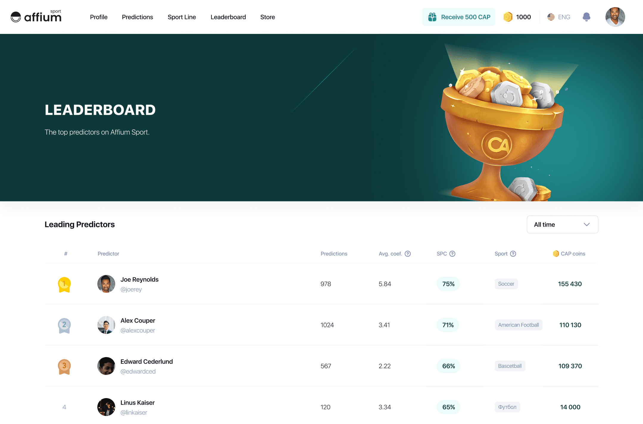 Affium Sport turns every user interaction into progress - from achievements and leaderboards to daily coin rewards and referrals. Keep users coming back every day.